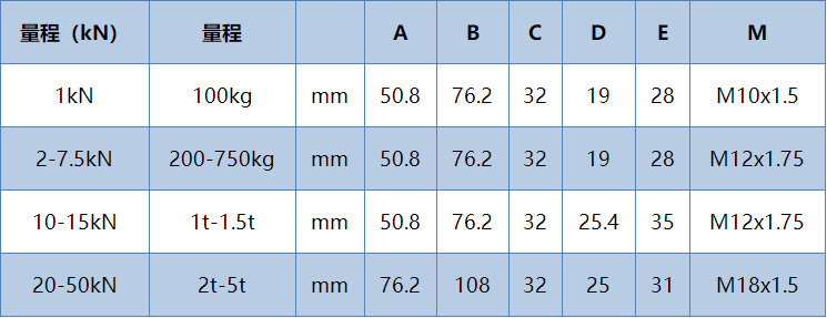量程:1kN(100kg)、2kN(200kg)、25kN(250kg)、5kN(500kg)、75kN(750kg)、10 kN(1t)、15 kN(1.5t)、20 kN(2t)、25 kN(2.5t)、50 kN(5t)、100 kN(10t)