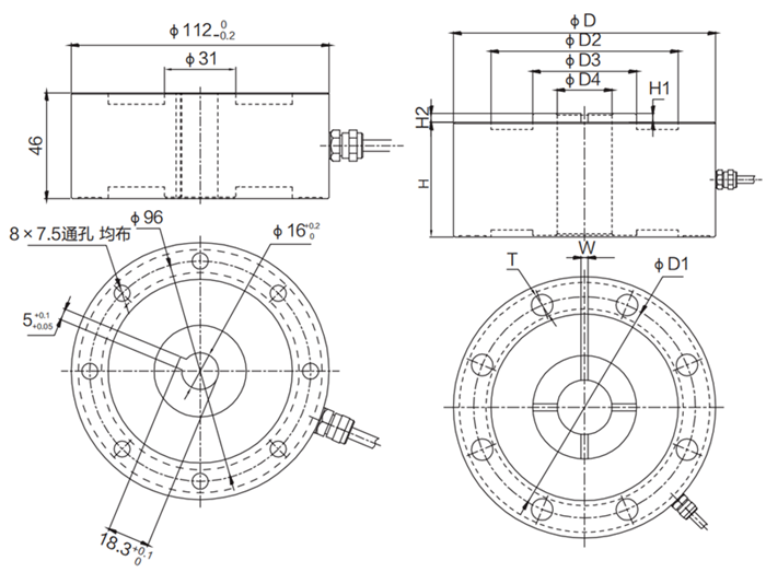 量程(t) D D1 D2 D3 D4 H H1 H2 W T 5t-10t ?130 ?105 ?84 ?48 ?32 55 6 6 4×5 8×Φ14 20t-30t ?182 ?154 ?130 ?72 ?39 80 6 6 4×5 8×Φ15
