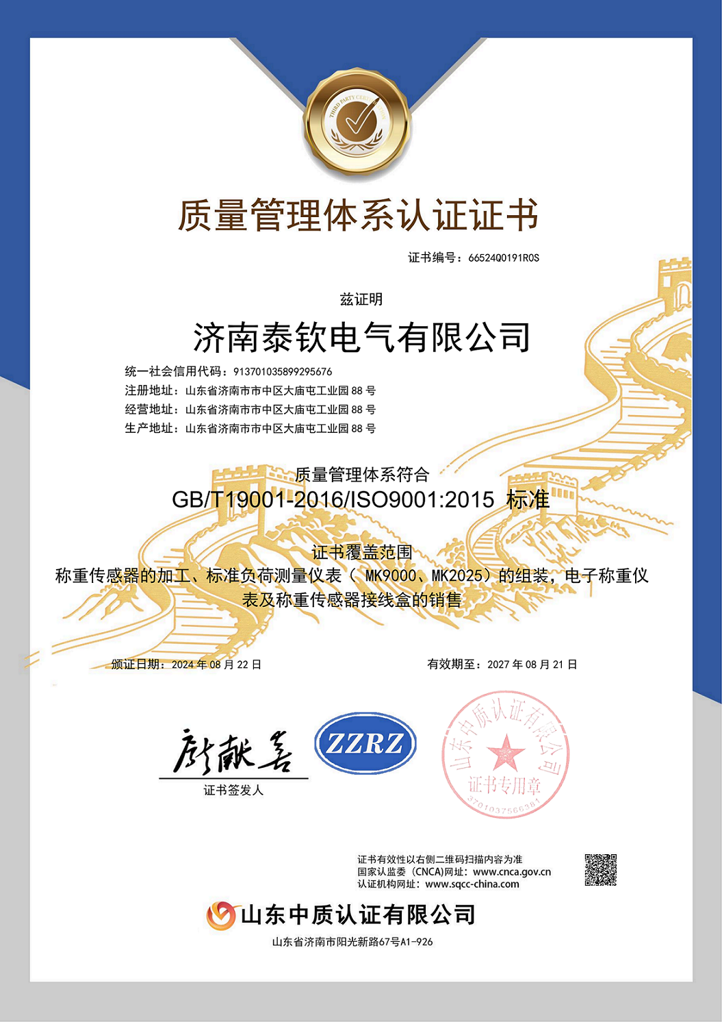 濟南泰欽傳感器,最新ISO9001質量體系認證證書