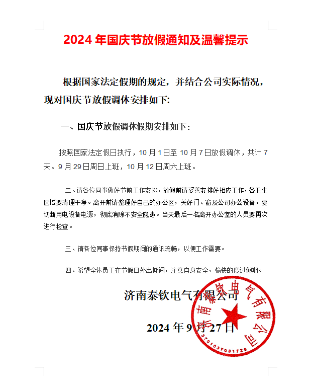 濟(jì)南泰欽傳感器國(guó)慶放假通知