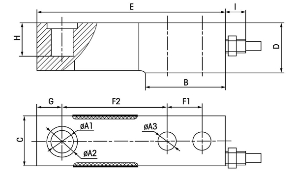 型號 | 量程(kN) | 量程(t) | ΦA(chǔ)1 | ΦA(chǔ)2 | ΦA(chǔ)3 | B | C | D | E | F1 | F2 | G | H | I | J |