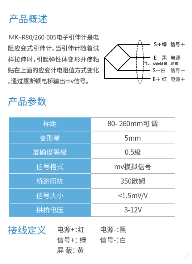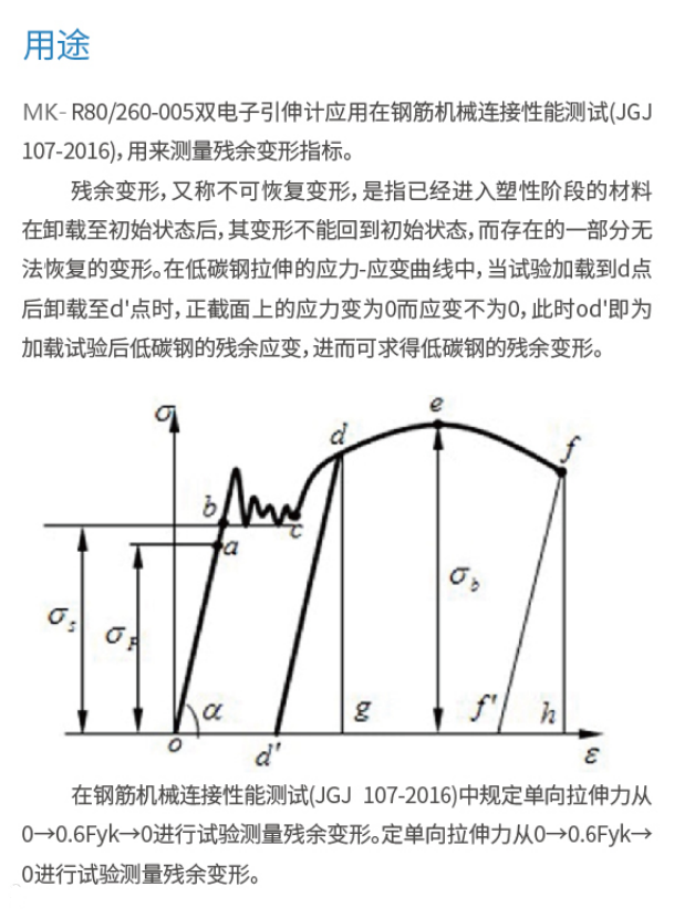MK-R80/260-005電子引伸計是電阻應(yīng)變式引伸計,當(dāng)引伸計隨著試樣拉伸時,引起彈性體變形并使粘貼在上面的應(yīng)變計電阻值方式變化,通過惠斯頓電橋輸出mv信號。主要應(yīng)用在鋼筋機械連接性能測試(JGJ107-2016),用來測量殘余變形指標(biāo)。